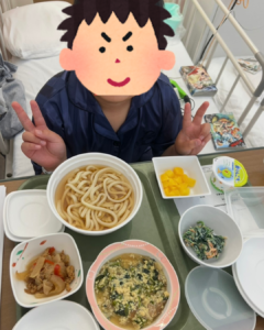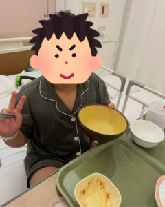 | 4日目 | 8/28 (木) | 点滴抜去、食欲波あり | 管理栄養士相談 軟飯or麺、おかず柔らかめに変更 | だるさ・痛みあり |