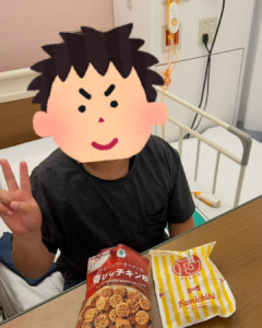 夕方は看護師さんの「術後は食べられないかもしれないから好きなものを食べてね」という言葉のもと、院内のコンビニで買ったファミチキやベビースターを笑顔で食べ、病院の夕食も完食!!